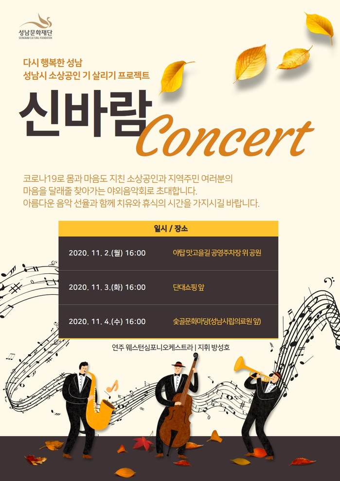 성남문화재단이 주최하고 성남시상인연합회가 후원하는 이번 야외음악회 ‘신바람 콘서트’는 코로나19로 경제적 어려움을 겪고 있는 소상공인을 응원하고, 문화향유의 기회를 잃은 지역주민들에게 음악을 통해 치유와 활력을 주기 위해 마련됐다.