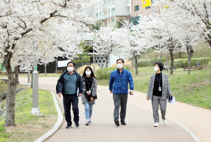 경기 수원시 권선구는 지난 2일 봄철을 맞아 금곡동 소재의 금곡천 수변공원 일원을 이용하는 주민불편을 해소하기 위해 현장을 점검했다. 사진은 서경보 구청장(오른쪽에서 두 번째)과 관계 직원들이 금곡천 수변 산책로를 점검하고 있는 모습. (사진제공=권선구청)