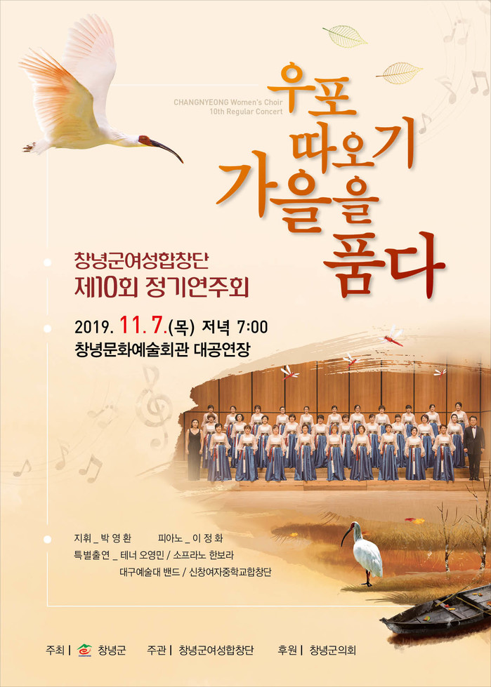 창녕군(군수 한정우)은 오는 7일 오후 7시, 창녕문화예술회관 대공연장에서 ‘우포따오기 가을을 품다’라는 주제로 창녕군여성합창단 제10회 정기연주회를 개최한다고 밝혔다.
