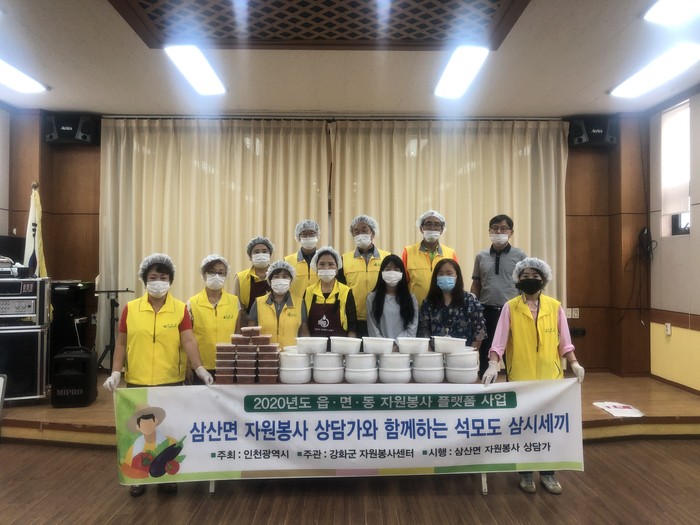 인천 강화군 자원봉사센터에서는 최근 삼산면 자원봉사 상담가와 함께 사랑의 도시락 나눔 ‘석모도 삼시세끼’ 행사를 했다. 이날 봉사자들은 삼계탕과 밑반찬을 만들어 지역내 홀몸노인 30여명에게 비대면으로 전달했다. 사진은 행사에 참여한 봉사자들이 기념촬영을 하는 모습. (사진제공=강화군청)