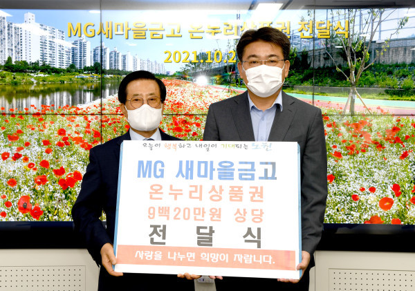 서울 노원구는 27일 MG새마을금고로부터 코로나19 극복을 위해 현장에서 헌신하고 있는 의료진을 격려하기 위한 온누리상품권(약 920만원)을 전달받았다. 사진은 전달식에서 오승록 구청장(오른쪽)이 정천득 이사장과 기념촬영을 하는 모습. (사진제공=노원구청)