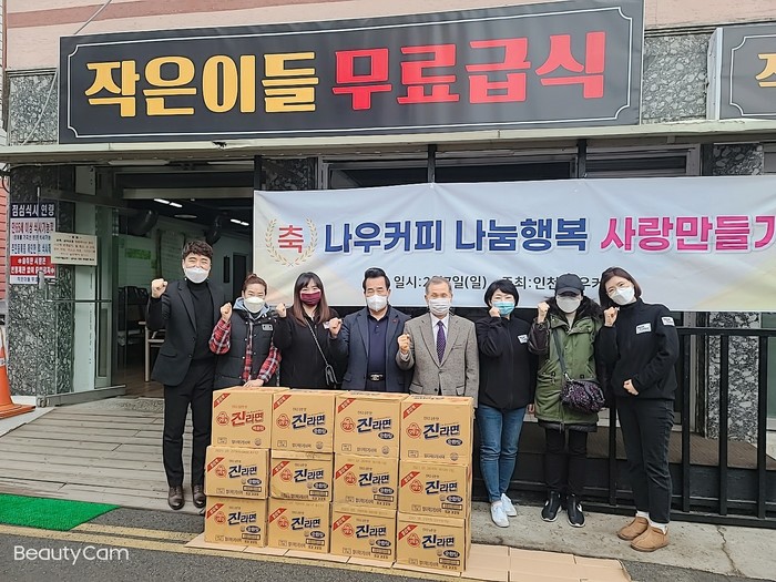 ‘나눔행복 사랑만들기 라면 기부’는 인천나우커피 주최로 열렸으며 동구청점·신기점·용현점·숭의점·도화점·주안북부점 운영자들이 함께, 의지할 곳 없는 사회적 약자들이 따뜻한 겨울을 보내기를 바라는 마음을 십시일반 모았다.