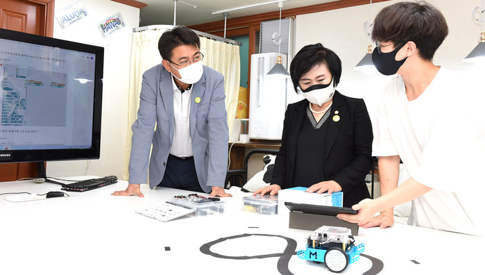 | ▲ 청년가게 6호점 코딩교습소를 방문한 오승록 구청장(왼쪽)이 관계자와 이야기를 나누고 있는 모습. (사진제공=노원구청) |