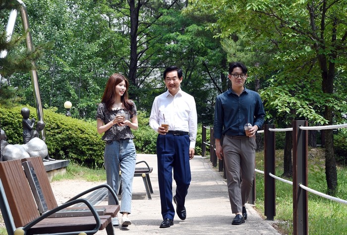 | ▲ 안병용 시장(가운데)이 직원들과 함께 직동공원 산책로를 거닐며 나무숲길 조성사업에 관해 이야기를 나누고 있다.(사진제공=의정부시청) |