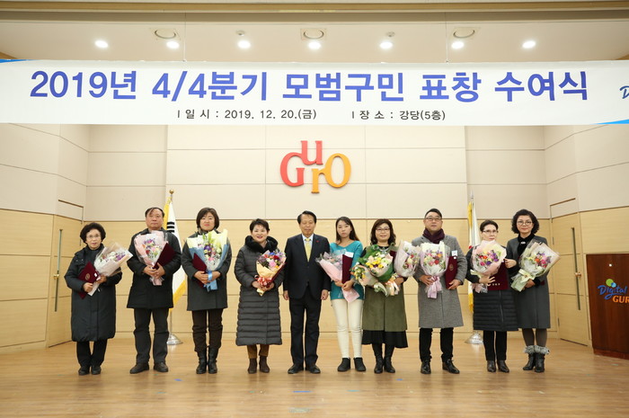 서울 구로구가 최근 2019년 4분기 모범구민 표창 수여식을 열고 지역사회를 위해 헌신한 총 128명에게 표창을 수여했다. 사진은 표창 수여자들과 기념촬영을 하고 있는 이성 구청장(가운데)의 모습. (사진제공=구로구청)