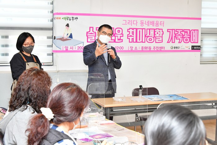 류경기 서울 중랑구청장은 지난 25일 중화동에 위치한 그리다 동네배움터에서 진행하는 슬기로운 취미생활 가죽공예 프로그램에 참석해 주민과 소통하는 시간을 보냈다. 사진은 류 구청장(가운데)이 인사말을 하는 모습. (사진제공=중랑구청)