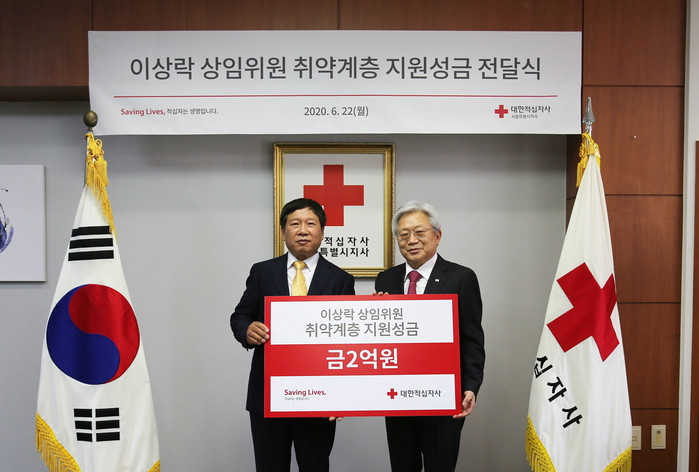 대한적십자사 서울특별시지사에 지난 22일 '신월동 기부천사'로 알려진 이상락씨가 취약계층 노인 지원을 위해 2억원을 기부했다. 사진은 기부식에서 이씨(왼쪽)가 김흥권 대한적십자사 서울지사 회장과 기념촬영을 하는 모습. (사진제공=대한적십자사)