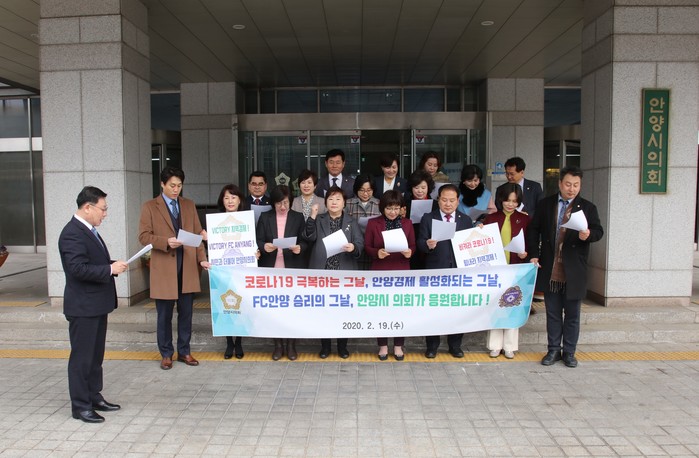 [시민일보 = 홍덕표 기자] 경기 안양시의회가 19일 제253회 임시회 2차 본회의에 앞서 시의회 현관 앞에서 지역경제 활성화 및 FC안양 홍보를 위한 성명을 발표했다.