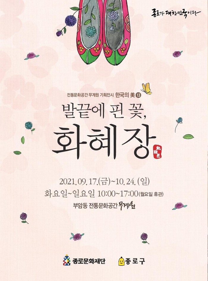 [시민일보 = 이대우 기자] 서울 종로구(구청장 김영종) 전통문화공간 무계원(창의문로5가길 2)에서 오는 24일까지 ‘한국의 美(미)’ 13번째 전시 ‘발끝에 핀 꽃, 화혜장’이 열린다.