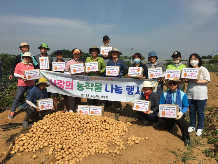 [고양=이기홍 기자] 고양시 백석2동 주민자치위원회는 지난 23일 사랑의 농작물 나눔 사업의 일환으로 감자를 수확해 관내 어려운 이웃 17가구에 나눔을 실천했다.