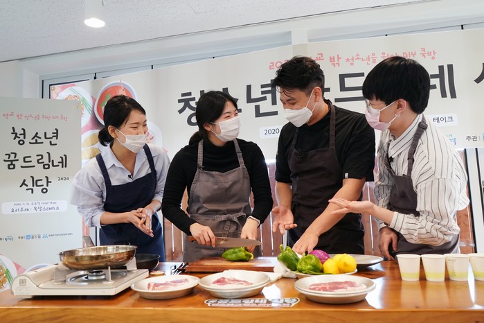 서울 동대문구청소년지원센터 꿈드림에서 최근 학교밖 청소년을 위한 문화행사 ‘청소년 꿈드림네 식당’이 열렸다. 사전 배송된 요리 재료를 이용해 실시간 방송을 보며 셰프의 진행에 따라 가정에서 요리하는 쌍방향 소통 쿡방 프로그램이다. 사진은 참여자들이 ‘청소년 꿈드림네 식당’을 진행하고 있는 모습. (사진제공=동대문구청)