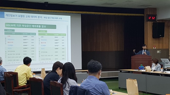 기조 강연을 맡은 정광훈 한국교육학술정보원 빅데이터분석부장은 “개인정보 보호와 관련 산업 발전이 조화될 수 있도록 개인정보 보호 관련 법령을 체계적으로 정비했다”며 법률 개정의 이유를 설명했다. 정 부장은 “도교육청은 위기 학생 인지, 교육복지, 교육 수요 예측, 지역교육 환경조성, 학생의 건강/안전 영역, 교원복지, 업무경감, 진로교육, 학력향상, 교육재정 등의 분야에서 데이터 분석이 가능하다”고 제안하였다.
