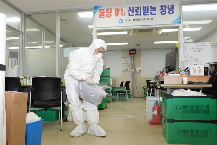 한정우 창녕군수는 지난 23일 장애인직업재활시설인 창녕군장애인근로사업장을 찾아 직접 소독·방역을 실시하고 근로장애인을 격려했다.