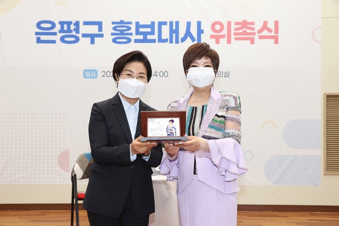 서울 은평구는 지난 12일 대표 트로트 가수 김연자씨를 홍보대사로 위촉했다. 은평구민인 김씨는 이번 홍보대사 위촉을 계기로 앞으로 구 홍보와 행사 참여 등 다양한 활동을 이어나갈 예정이다. 사진은 위촉식에서 김미경 구청장(왼쪽)과 김씨가 기념촬영을 하는 모습. (사진제공=은평구청)