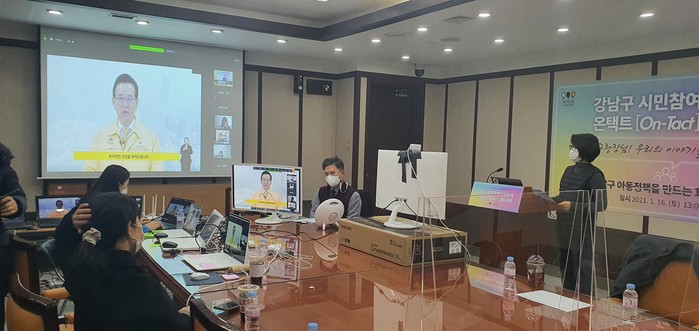 강남구는 지난 16일 100인 시민참여 아동정책 온택트(On-tact) 대토론회를 개최했다. 이번 토론회에서는 놀이와 여가·참여와 시민의식·안전과 보호 등 6가지 정책 의제에 대해 모둠별로 의견을 나누고 토론 내용을 발표하며 정책투표도 진행했다. 사진은 정순균 구청장이 화면으로 인사말을 하고 있는 모습. (사진제공=강남구청)