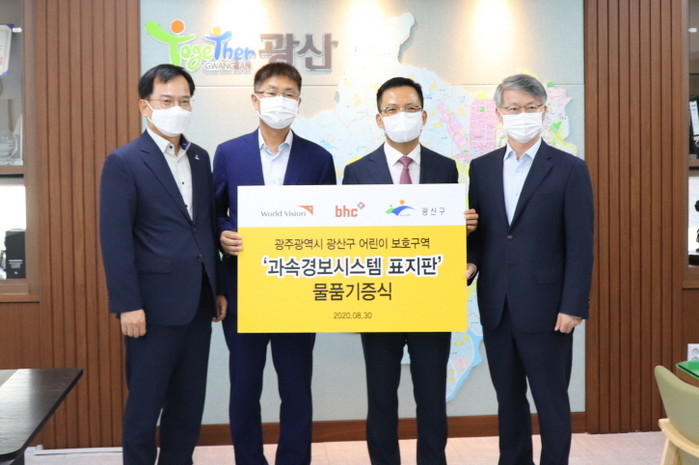 bhc치킨은 서울시 노원구를 시작으로, 광진구, 강북구, 구로구, 충남 아산시 등 어린이 보호구역 내 과속경보시스템 표지판 설치를 진행한 데 이어 지난 30일, 광주광역시 광산구청에서 과속경보시스템 표지판 관련 기증식을 개최했다.