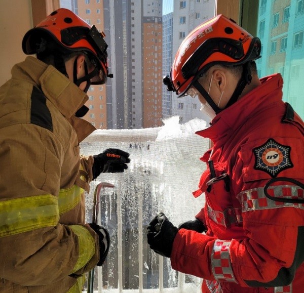 최근 인천송도소방서 119구조대가 아파트 베란다에 고드름이 달려있다는 신고를 받고 출동해 절연봉을 이용해 고드름을 안전하게 제거했다. 사진은 베란다에 설치된 샤워기 노즐이 동파돼 얼어붙은 고드름을 깨고 있는 구조대원들의 모습. (사진제공=인천송도소방서)