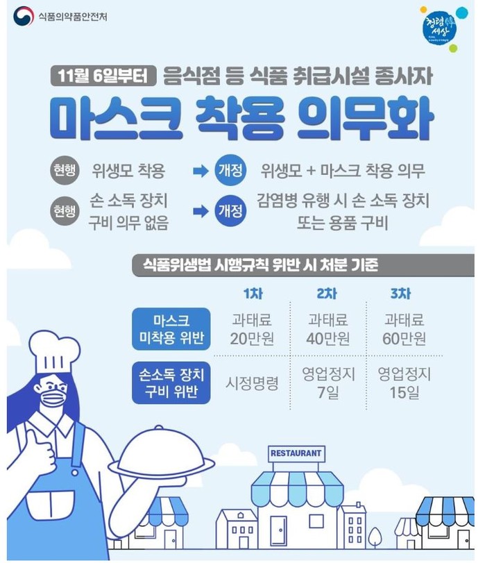기존의 식품시설 종사자는 위생모만 착용하면 되었으나 이번 개정으로 위생모와 함께 마스크 착용 후 영업에 종사해야 하며, 마스크는 보건용 마스크뿐 아니라 조리용 및 일회용 등 비말을 막을 수 있는 마스크는 모두 가능하다.