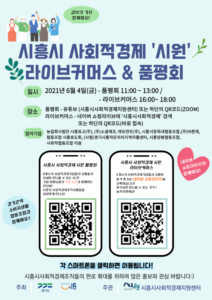 행사는 오전, 오후로 나누어 11시부터 오후 1시까지는「시흥시 사회적경제 시원 품평회」, 오후 4시부터 6시까지는 「시흥시 사회적경제 시원 라이브커머스」순으로 진행된다.