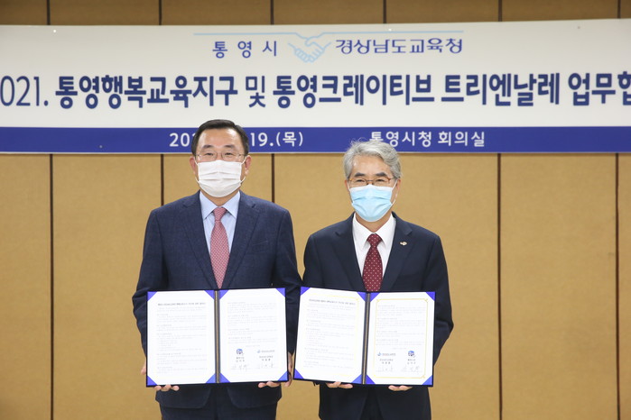 경상남도교육청(교육감 박종훈)과 통영시(시장 강석주)는 2021. 통영행복교육지구 및 통영크레이티브 트리엔날레 업무 협약식을 지난 19일(목) 오후 3시 통영시청 회의실에서 가졌다.
