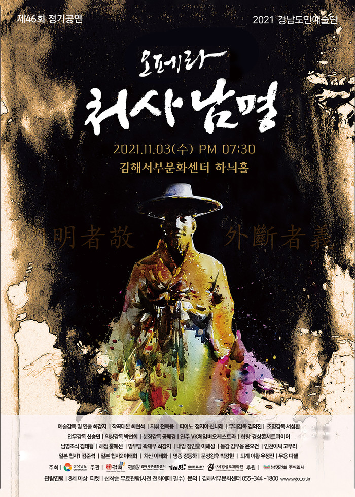 경상남도가 주최하고 김해시, (재)김해문화재단, (사)경상오페라단이 주관하는 이번 공연은 남명조식 선생의 경의(敬義)사상을 소재로 한 창작 오페라로