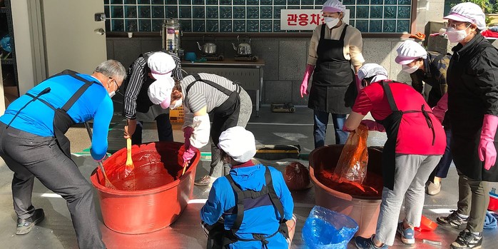 인천 서구 청라2동 지역사회보장협의체는 최근 인천사회복지공동모금회 지원으로 지역내 다문화·북한이탈주민가정, 한부모·저소득 취약계층 등 60여가구에 고추장을 손수 담가 나누는 행사를 개최했다. 사진은 고추장을 담그고 있는 모습. (사진제공=서구청)