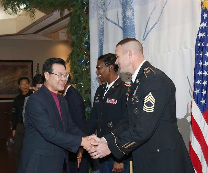 성장현 용산구청장이 7일 미군기지 드래곤힐호텔에서 열린 주한미군 용산기지사령부 신년리셉션에 참석했다. 이날 행사는 미군·국방부·연합사 관계자 등 100명이 자리한 가운데 진행됐다. 사진은 성 구청장이 관계자들과 인사를 나누는 모습. (사진제공=용산구청)