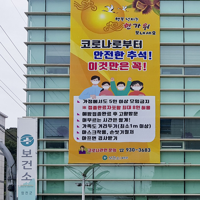 합천군보건소는 코로나19 로부터 안전한 추석을 위하여 ▲ 가정에서도 5인 이상 모임금지(예방접종완료자 포함 시 최대 8인 허용) ▲ 예방접종완료 후 고향 방문하기(부모님이 미접종자일 경우 고향방문 미루기) ▲고향에서 머무르는 시간은 짧게 ▲ 마스크착용 및 손씻기 철저 ▲ 아프면 검사받기 등을 지켜줄 것을 당부했다.