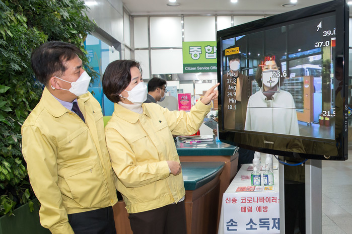서울 양천구청이 중국 우한시에서 발생한 '신종코로나바이러스 감염증(우한 폐렴)' 전파 가능성이 커짐에 따라 구청 1층 본관에 열감지 카메라를 설치해 발열 여부를 상시 점검할 수 있도록 했다. 사진은 열감지 카메라를 테스트하고 있는 김수영 구청장(왼쪽에서 두 번째)의 모습. (사진제공=양천구청)