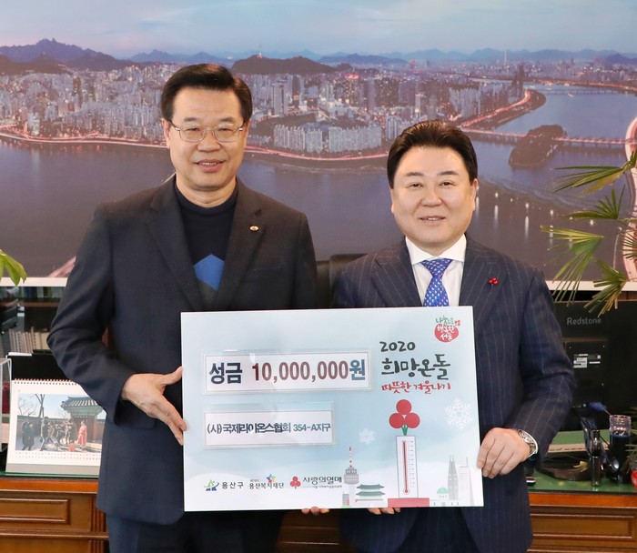 용산구가 10일 국제라이온스협회 354-A지구로부터 따뜻한 겨울나기 성금 1000만원을 전달받았다. 이날 성금 전달식에는 성장현 구청장을 비롯 모영배 총재, 관계 공무원 등 10명이 참석했다. 사진은 성 구청장(왼쪽)과 모 총재의 기념촬영 모습. (사진제공=용산구청)