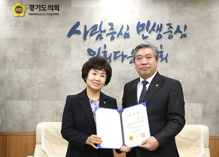 | ▲ 결산검사 대표위원으로 선출된 황진희 경기도의원이 송한준 의장으로부터 위촉장을 받았다. 사진은 기념촬영 모습. (사진제공=경기도의회) |