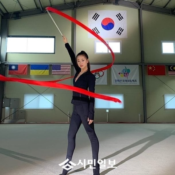 공개된 사진 속 손연재는 검정색 운동복 차림으로 리본 포즈를 취하는 모습.