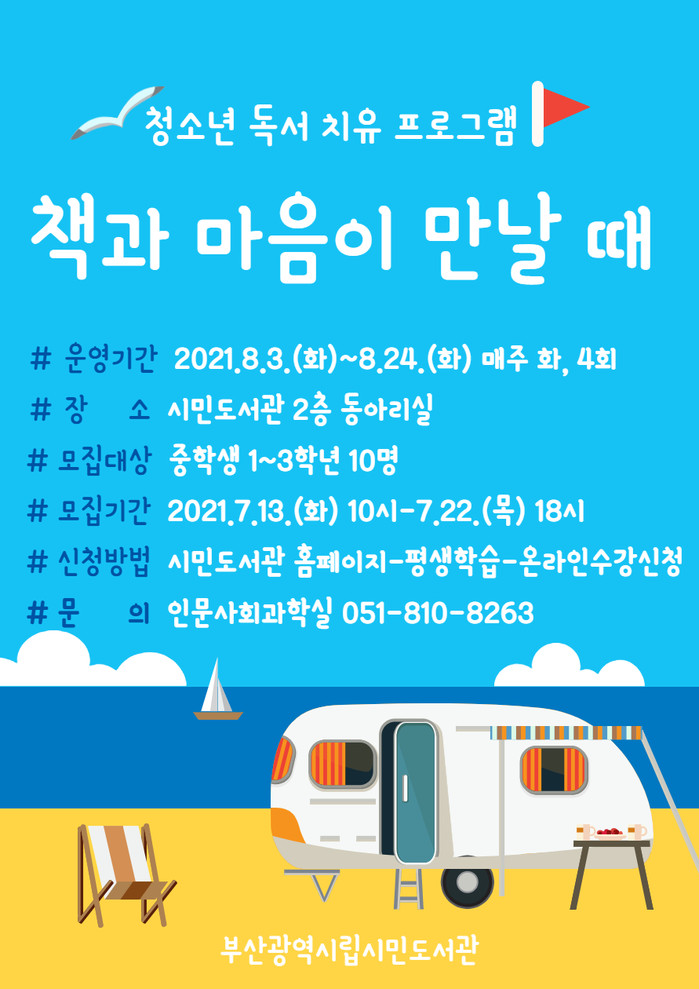 부산광역시립시민도서관(관장 김흥백)은 오는 8월 3일부터 24일까지 매주 화요일 오후 2시 도서관 2층 동아리실에서 중학생 10명을 대상으로 청소년 독서치유 프로그램‘책과 마음이 만날 때’를 운영한다.