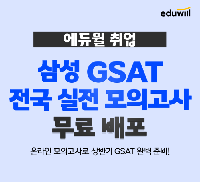 삼성 취업 준비생을 위한 에듀윌 취업의 온라인 모의고사는 오는 28일까지 무료 신청이 가능하며, 29일에 시험에 응시할 수 있다. 신청자 전원에게 GSAT 온라인 모의고사 무료 응시 기회를 제공하며, 삼성 단기패스와 언택트 패키지 할인 쿠폰도 제공한다. 또, 응시자 전원에게 GSAT 봉투모의고사를 무료로 제공한다.