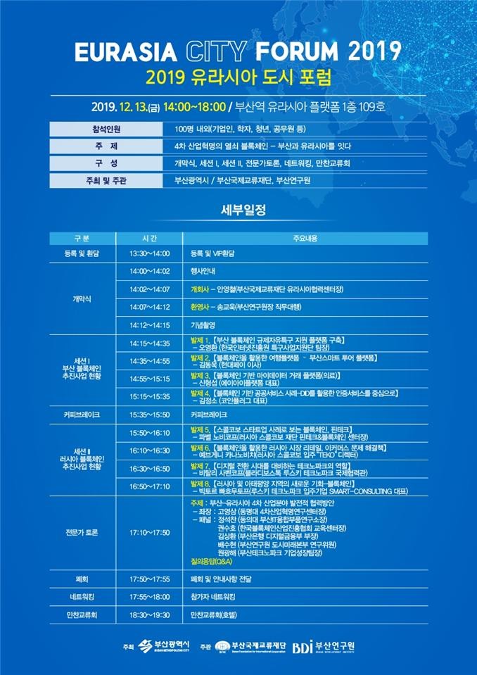 부산국제교류재단과 부산연구원은 오는 12월 13일(금) 오후 2시, 부산역 유라시아 플랫폼에서 『2019 유라시아 도시포럼』을 개최한다고 밝혔다.