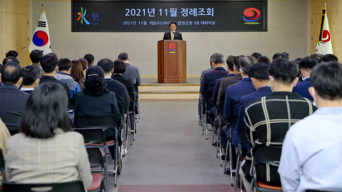 합천군(군수 문준희)은 3일 오전 9시 군청 대회의실에서 11월 정례조회를 개최했다. 이번 정례조회는 코로나 백신접종 완료자인 공직자 및 일반인 100여 명이 참석한 가운데 ‘단계적 일상회복(위드 코로나)’으로의 첫걸음을 시작했다는 점에서 의미가 있다.
