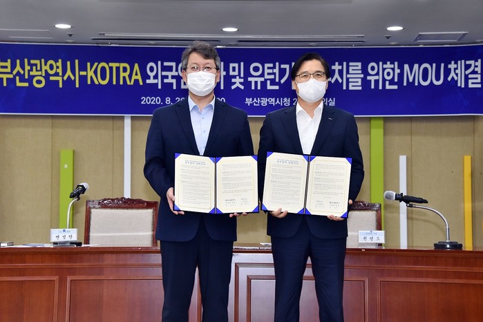 부산시(시장 권한대행 변성완)는 8월 26일 오전 11시 시청 26층 회의실에서 대한무역투자진흥공사(사장 권평오, 이하 코트라)와 「외국인 투자 및 유턴기업 유치를 위한 업무협약」을 체결했다고 밝혔다.