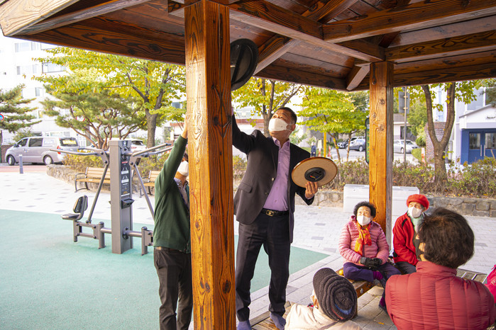 | ▲ 이상수 의원이 주민들의 이용이 많은 공원 정자에 시계를 설치하고 있는 모습. (사진제공=강북구의회) |
