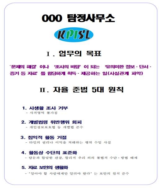 이와 관련, 한국민간조사학술연구소(kpisl, 소장 김종식)는 지난해부터 탐정(업)의 직업윤리 확립과 업태의 건전성 유지에 초점을 맞춘 ‘자율 준법 5대 원칙’을 탐정업 종사자들에게 제시·보급하고 있다.