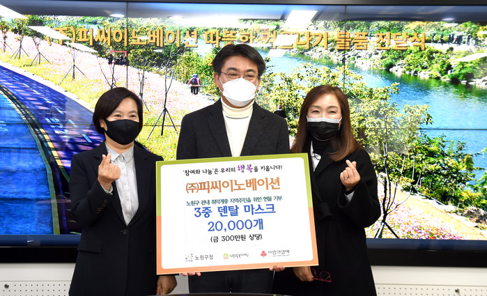 서울 노원구는 최근 (주)피씨이노베이션으로부터 3중덴탈마스크 2만개(300만원 상당) 후원물품을 전달받았다. 구는 마스크를 코로나19 확산 예방을 위해 지역내 취약계층 홀몸노인들에게 지원할 예정이다. 사진은 전달식에서 오승록 구청장(가운데)과 관계자들이 기념촬영을 하는 모습. (사진제공=노원구청)