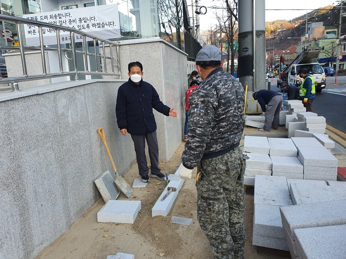 | ▲ 보도공사 현장을 방문한 정재호 의원이 현장을 살펴보고 있다. (사진제공=종로구의회) |