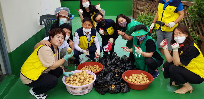 경기 수원시 권선구 세류1동 행정복지센터는 지난 19일 새마을부녀회 및 마을만들기협의회 등 단체원 20여명과 함께 동립말 옥상텃밭에 재배한 하지감자를 수확했다. 수확한 감자는 지역내 홀몸노인과 저소득층 가구 및 경로당에 사랑의 반찬 및 식재료로 제공될 예정이다. 사진은 이날 참여한 단체원들이 수확한 감자를 나눠 담으며 포즈를 취하는 모습. (사진제공=권선구청)