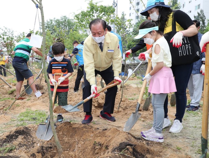 유동균 서울 마포구청장이 18일 경의선 선형의 숲 2단계구간(중동 18번지)에서 진행된 '마포구 푸른숲 조성을 위한 500만그루 나무심기' 행사에 참석했다. 사진은 유 구청장이 어린이들과 함께 나무를 심고 있는 모습. (사진제공=마포구청)