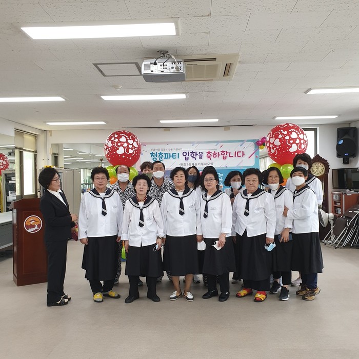 전남 순천시 왕조2동은 최근 동 행정복지센터에서 청춘파티 입학식을 열었다. 앞으로 65세 이상 노인들은 신흥중학교에서 오는 12월까지 매월 1회 교복을 입고 수업을 받으며 야외현장학습, 졸업식 등 다양한 활동을 하게 된다. 사진은 노인들이 교복을 입고 기념촬영을 하는 모습.(사진제공=순천시청)
