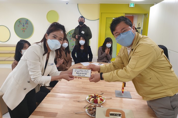 서양호 서울 중구청장이 지난 23일 오전 봉래초등학교 및 남산초등학교 돌봄교실 긴급돌봄 현장을 방문해 돌봄교사들의 노고를 격려했다. 이날 서 구청장은 코로나19 장기화에 따라 업무강도가 늘어난 돌봄교사들의 애로사항을 청취하고, 상황 종료 후 사용할 수 있도록 특별 유급휴가권(2일)을 전달했다. 사진은 서 구청장(오른쪽)이 봉래초등학교 돌봄교사와 휴가권을 들고 기념촬영을 하는 모습. (사진제공=중구청)