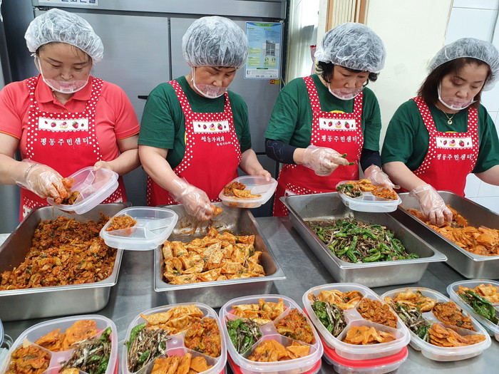 경기 수원시 권선구 평동 새마을부녀회는 7일 평동 행정복지센터에서 사랑의 반찬 나눔 봉사활동을 진행했다. 이날 새마을부녀회원들은 정성스레 만든 장떡과 꽈리고추 멸치볶음 등 4가지 종류의 반찬을 만들어 홀몸노인 40여가구에 전달했다. 사진은 부녀회원들이 반찬을 만들고 있는 모습. (사진제공=권선구청)