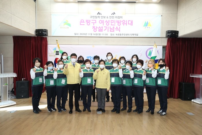 서울 은평구는 최근 여성민방위대장 예하 제1지역대·제2지역대 등 42명의 대원으로 편성된 '은평구 여성민방위대 창설식'을 개최했다. 창설식은 1부 창설기념식과 2부 소양·심폐소생술 교육을 실시했다. 사진은 창설식에 참여한 김미경 구청장(앞줄 가운데)과 대원들이 기념촬영을 하는 모습. (사진제공=은평구청)