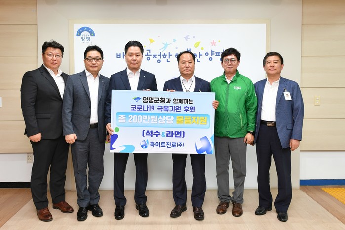 경기 양평군은 30일 하이트진로(주)로부터 코로나19 극복을 위한 물품으로 생수 100묶음, 라면 100상자를 전달받았다. 이 물품은 지역내 홀몸노인, 장애인가정 등 생계가 어려운 150여가구에 지원될 예정이다. 사진은 정동균 군수(오른쪽에서 세 번째)와 관계자들이 기념촬영을 하는 모습. (사진제공=양평군청)