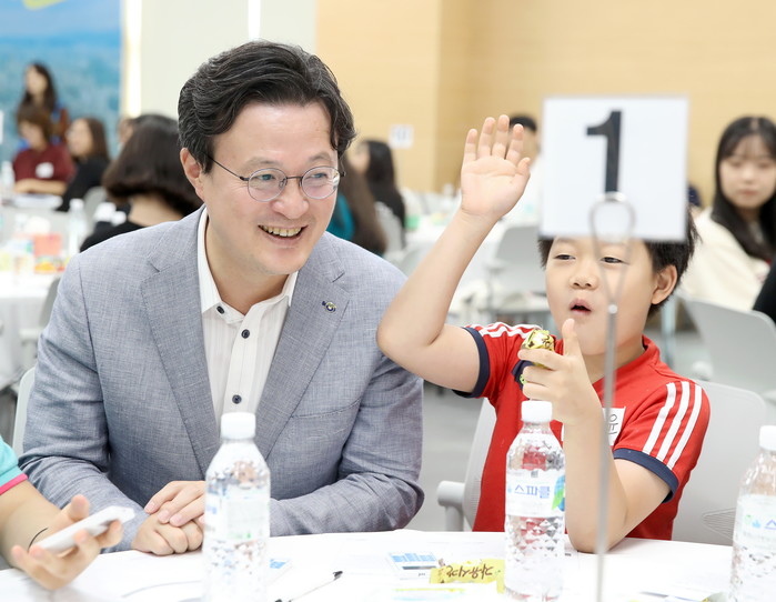 서울 영등포구는 아동이 행복한 아동친화도시를 만들기 위해 주민의 의견을 청취하고 반영하고자 최근 구청 별관 강당에서 ‘아동친화도시 시민 참여조사 원탁토론회’를 개최했다. 사진은 토론회에 참석한 채현일 구청장과 초등학생의 모습. (사진제공=영등포구청)