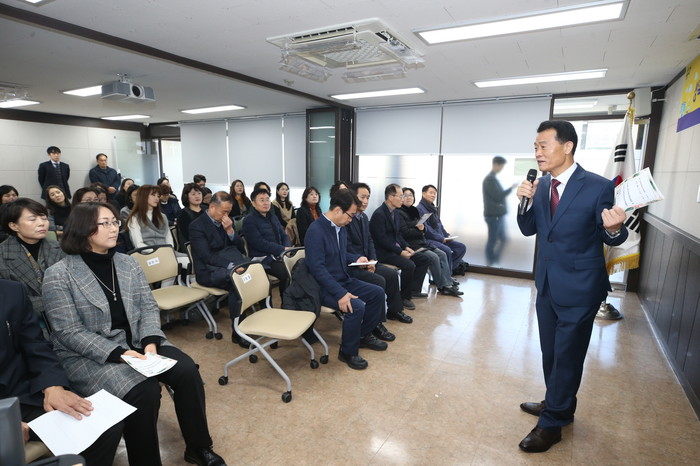 서울 성북구가 최근 이승로 구청장 및 지역 교사, 학부모 등이 참석한 가운데 청소년의 꿈을 지원하기 위한 성북청소년미래지원센터 출범과 함께 '성북미래교육선언문 제막식'을 열었다. 사진은 이 구청장(오른쪽)이 참가자들에게 소감을 밝히는 모습. (사진제공=성북구청)